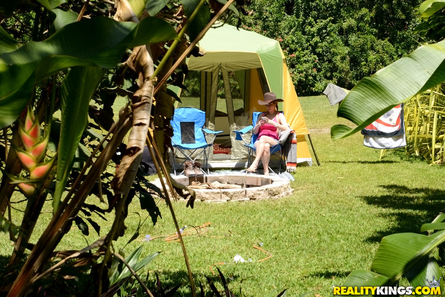 MILF in a pink top and denim bottoms gets naked to boink at campground